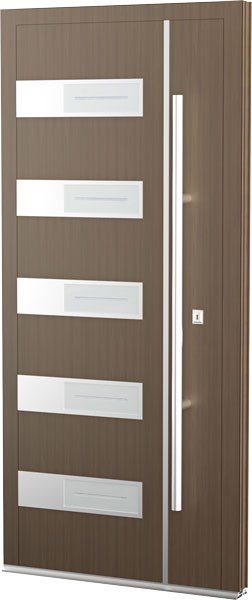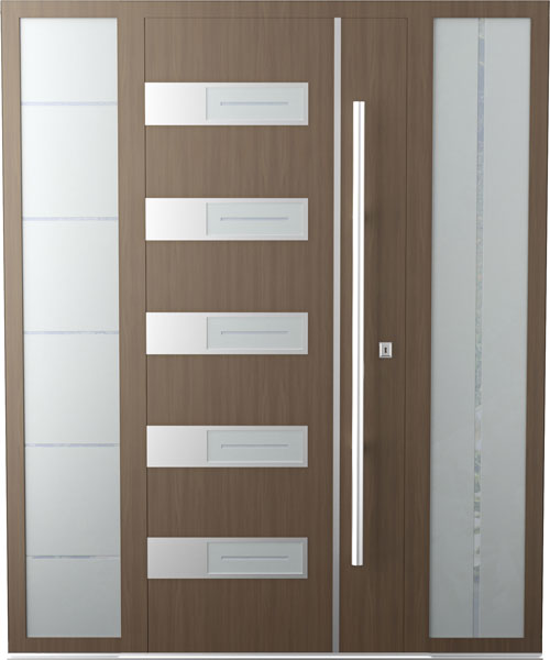 Vidro triplo com vidro exterior laminado de segurança com vidro central Float Fosco com as faixas gravado a jato de areia fazendo o seguimento do desenho da porta.