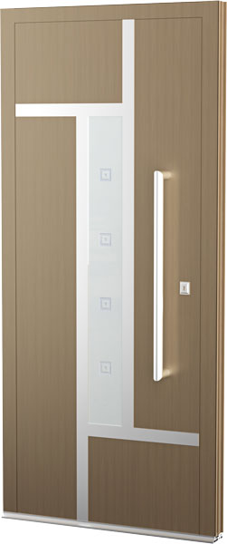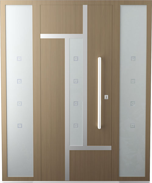Vidro triplo com vidro exterior laminado de segurança com vidro central Float Fosco com as faixas gravado a jato de areia fazendo o seguimento do desenho da porta.