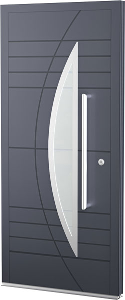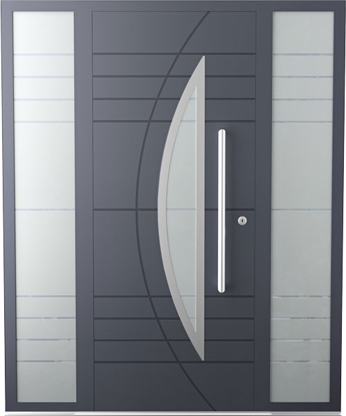 Vidro triplo com vidro exterior laminado de segurança com vidro central Float Fosco com as faixas gravado a jato de areia fazendo o seguimento do desenho da porta.