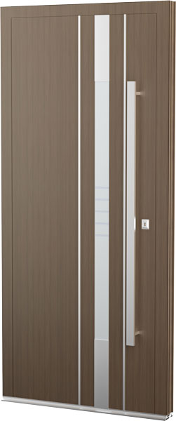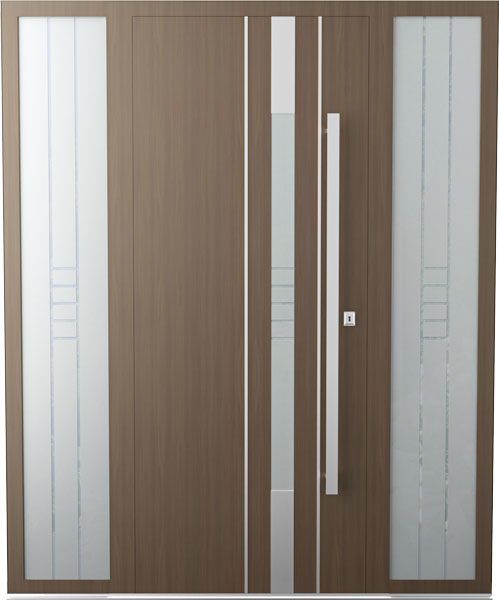 Vidro triplo com vidro exterior laminado de segurança com vidro central Float Fosco com as faixas gravado a jato de areia fazendo o seguimento do desenho da porta.