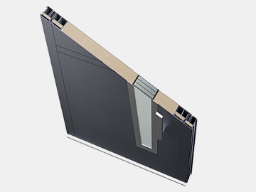 - Os perfis utilizados permitem oferecer um bloco com 105 mm. Este tipo de porta carateriza-se pelo revestimento da folha em ambas as faces, com chapas de alumínio de 2 mm de espessura obtendo-se, assim, um sistema de folha oculta alinhada com o aro nos dois lados.